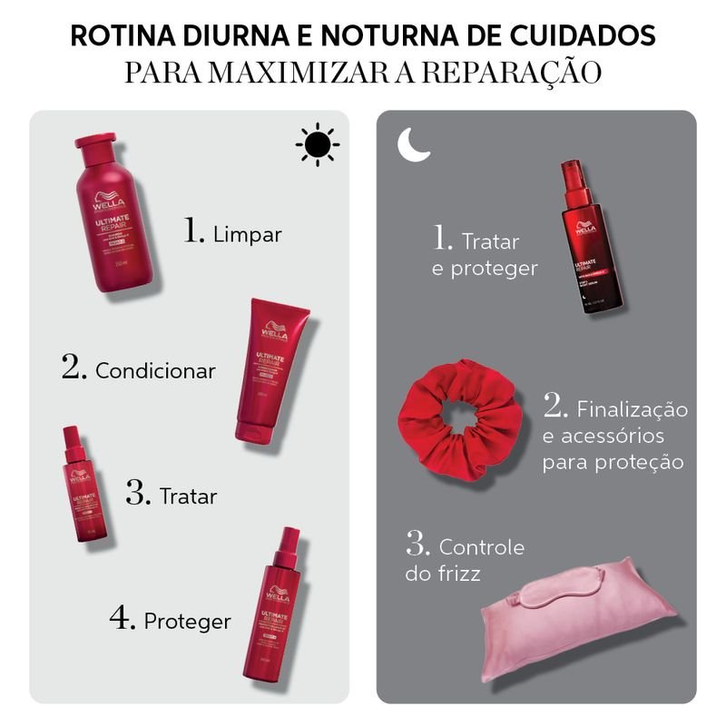 Sérum capilar indicado para todos os tipos de cabelo, o Wella Professionals Ultimate Repair Night Sérum 30ml repara visivelmente a fibra capilar danificada, hidrata profundamente e protege contra estressores noturnos durante o sono, garantindo fios até 6 vezes mais macios e com até 78% menos quebra ao acordar.